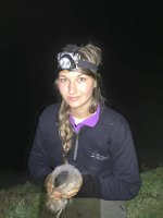 Monday arrived and after setting up the nets in the garden and doing a few rounds, the other four and Ben arrived and everyone got stuck in with the moth trap. It was a regular event to rush to the scopes to watch either Common or Risso’s dolphins jump or splash around in the sea as well as listening to the Seal’s calling to each other from all over the island. One evening Steve, Steffan and Ben led a walk for everyone to get to know the Manx Shearwaters of Bardsey, due to the moon and the lack of clouds it meant that there wasn’t a great deal of Manxies around, but some youngsters were coming out of their burrows meaning we could ring them! Mark and Jeff had set up some Storm Petrel nets and after almost giving up and beginning to head back to the lodge, Mark radioed to say they have two Stormies in the nets! As you can probably tell by the face in the picture, I was ecstatic! The smell of them is just divine but hard to describe.